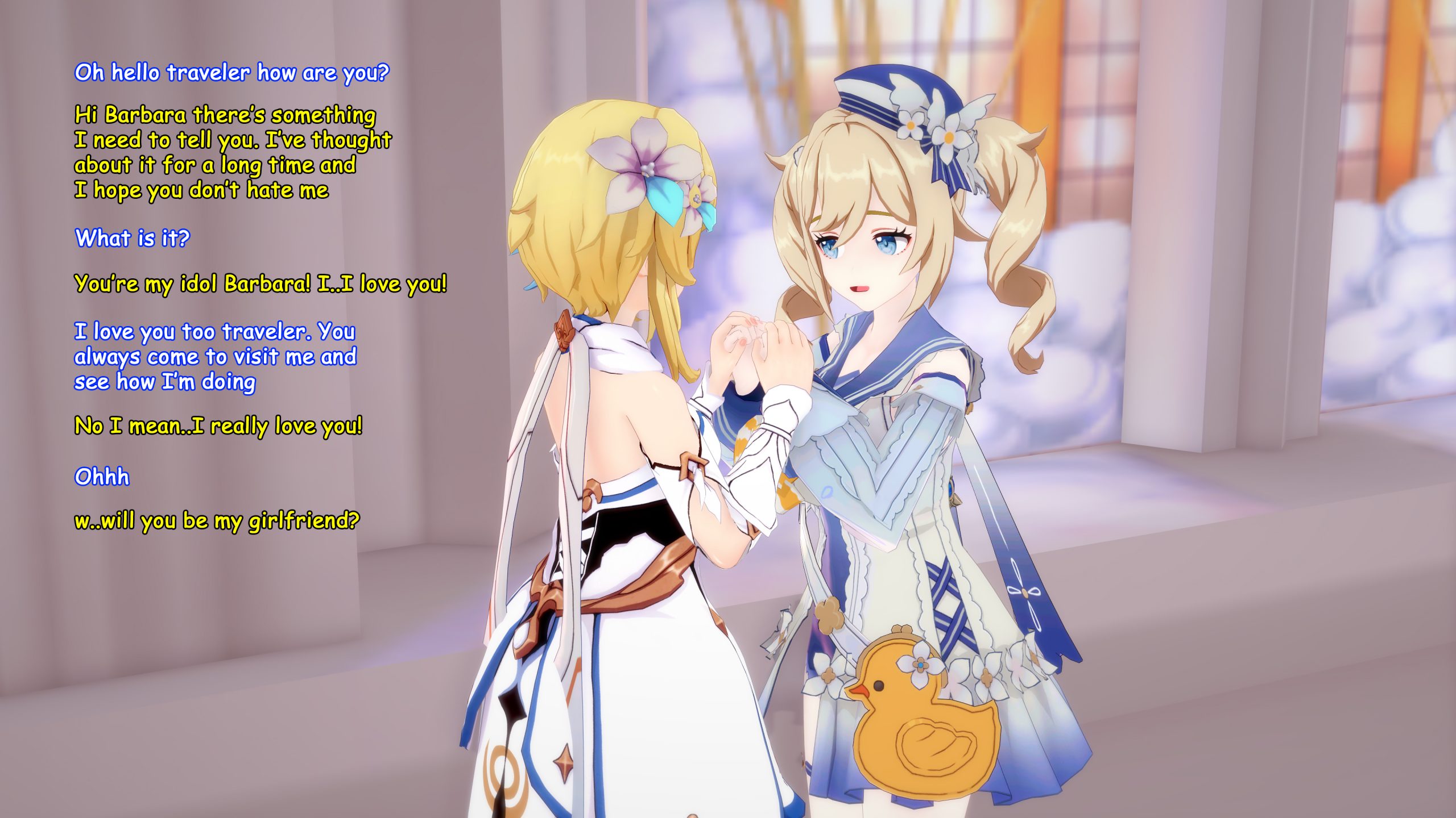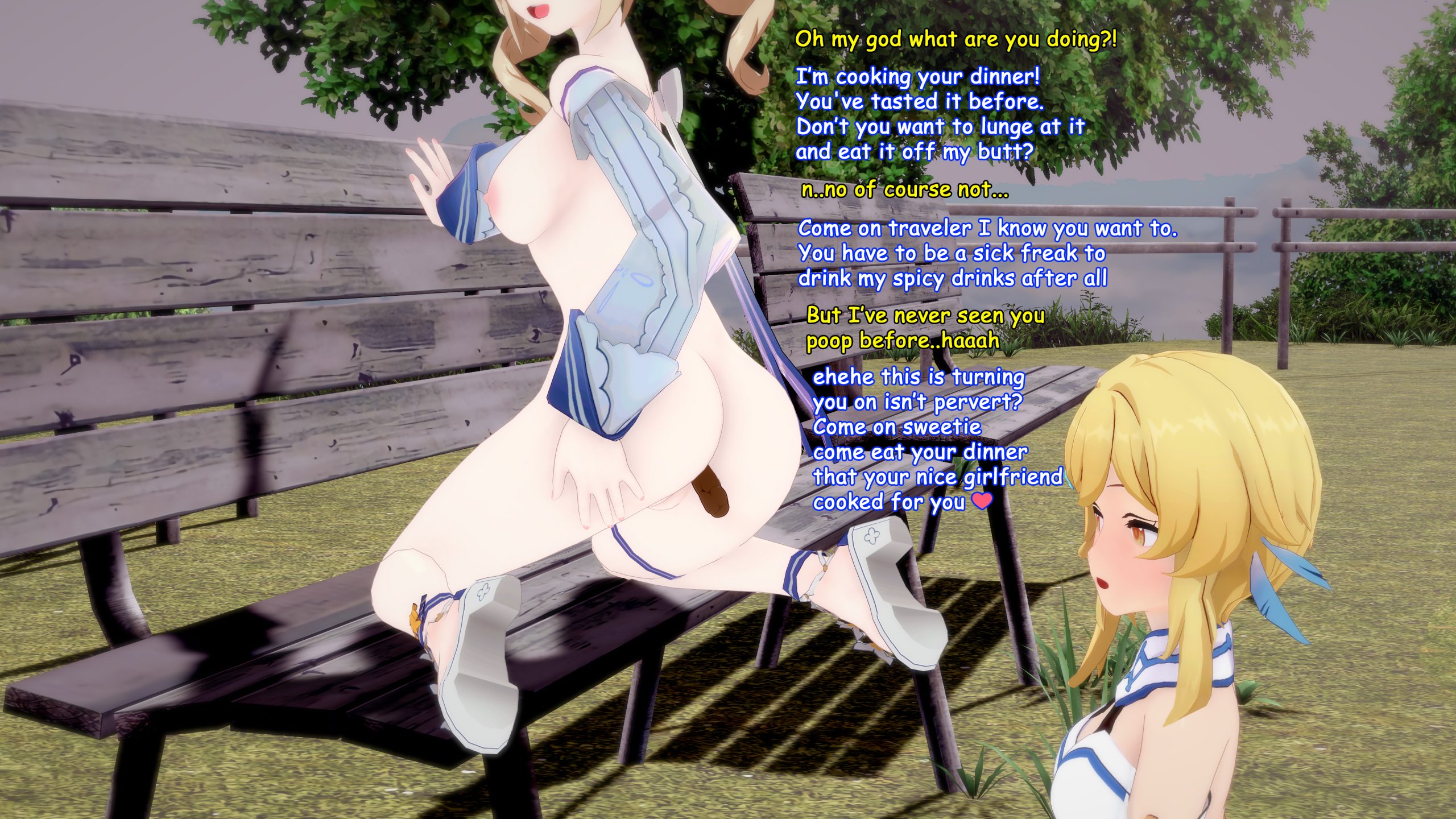 After visiting Barbara multiple times to drink her spicy drinks. The traveler finally sums up the courage to confess her love for Barbara. The traveler then becomes Barbara’s slave girlfriend. This story is continued from Traveler’s Adventure 1