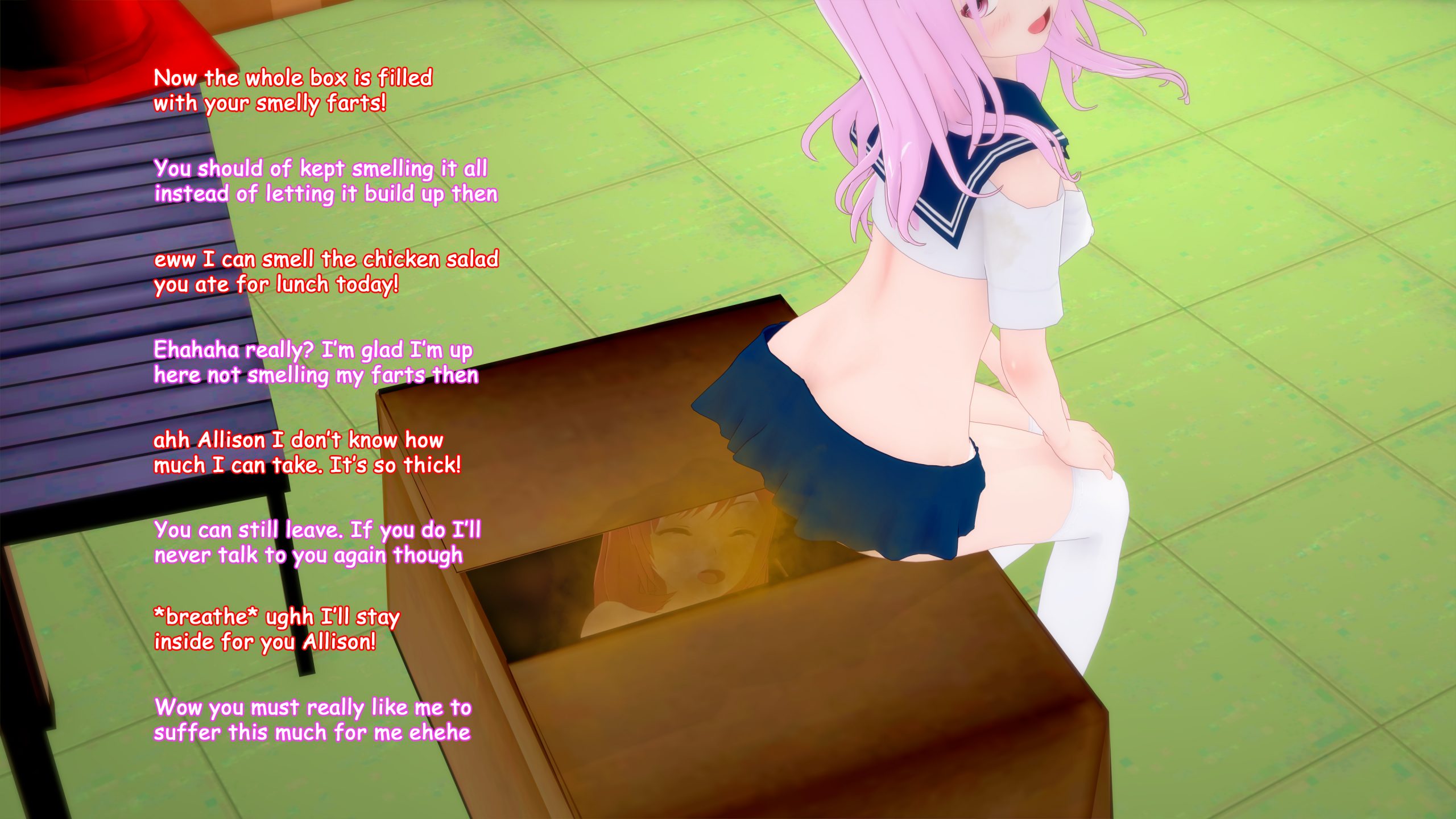 Allison: Pink Hair. A sadistic girl that loves to torture others with her farts